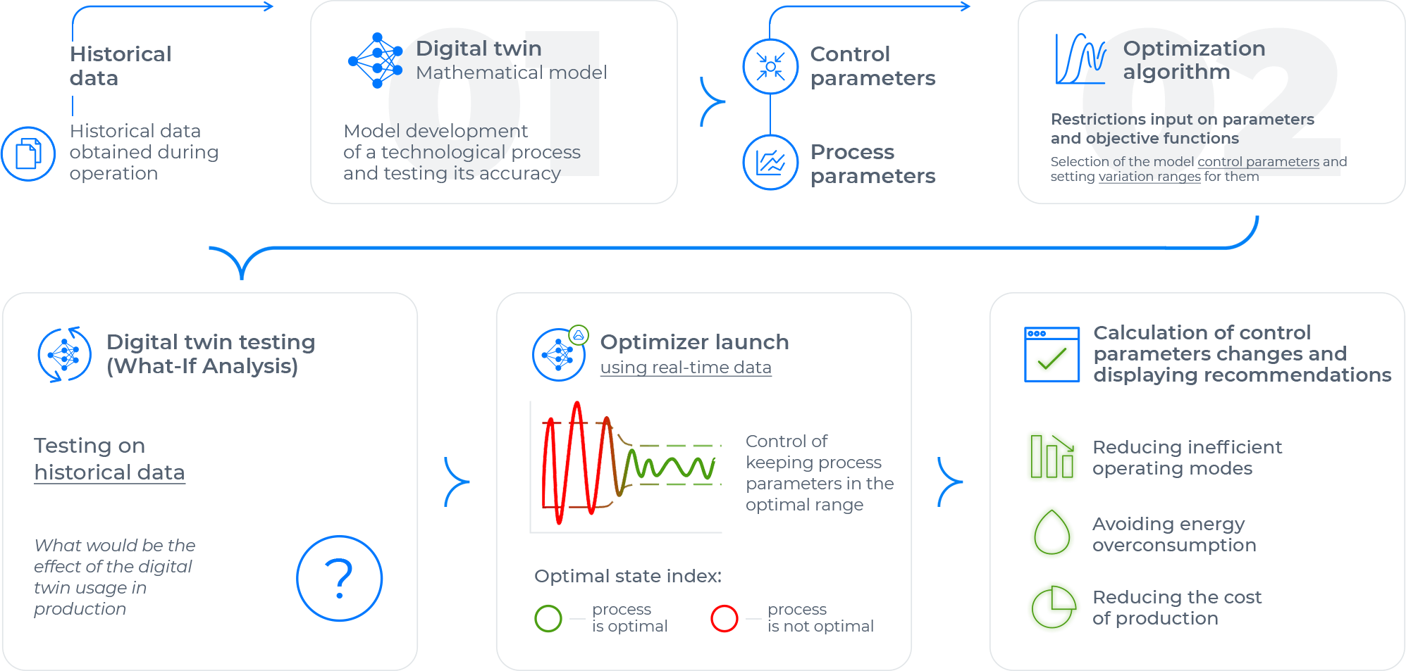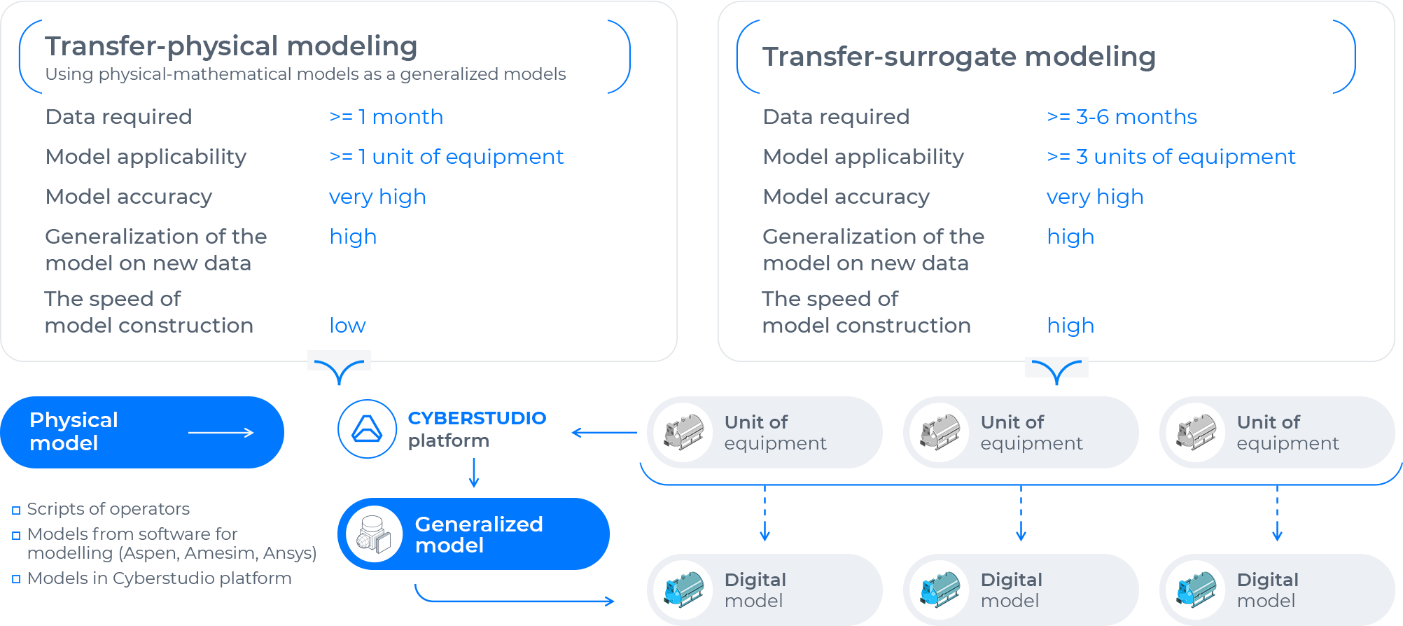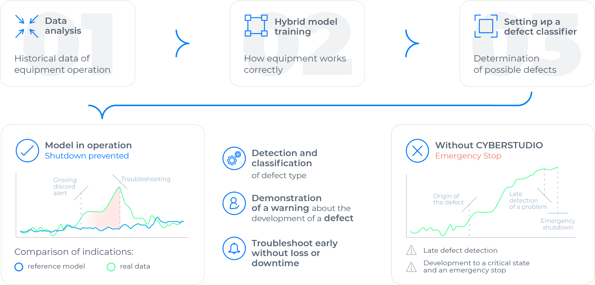 Building machine learning models based on the operational data. Additionally, a development of physics-based mathematical models of equipment to enhance model accuracy in cases of data scarcity (hybrid modeling).